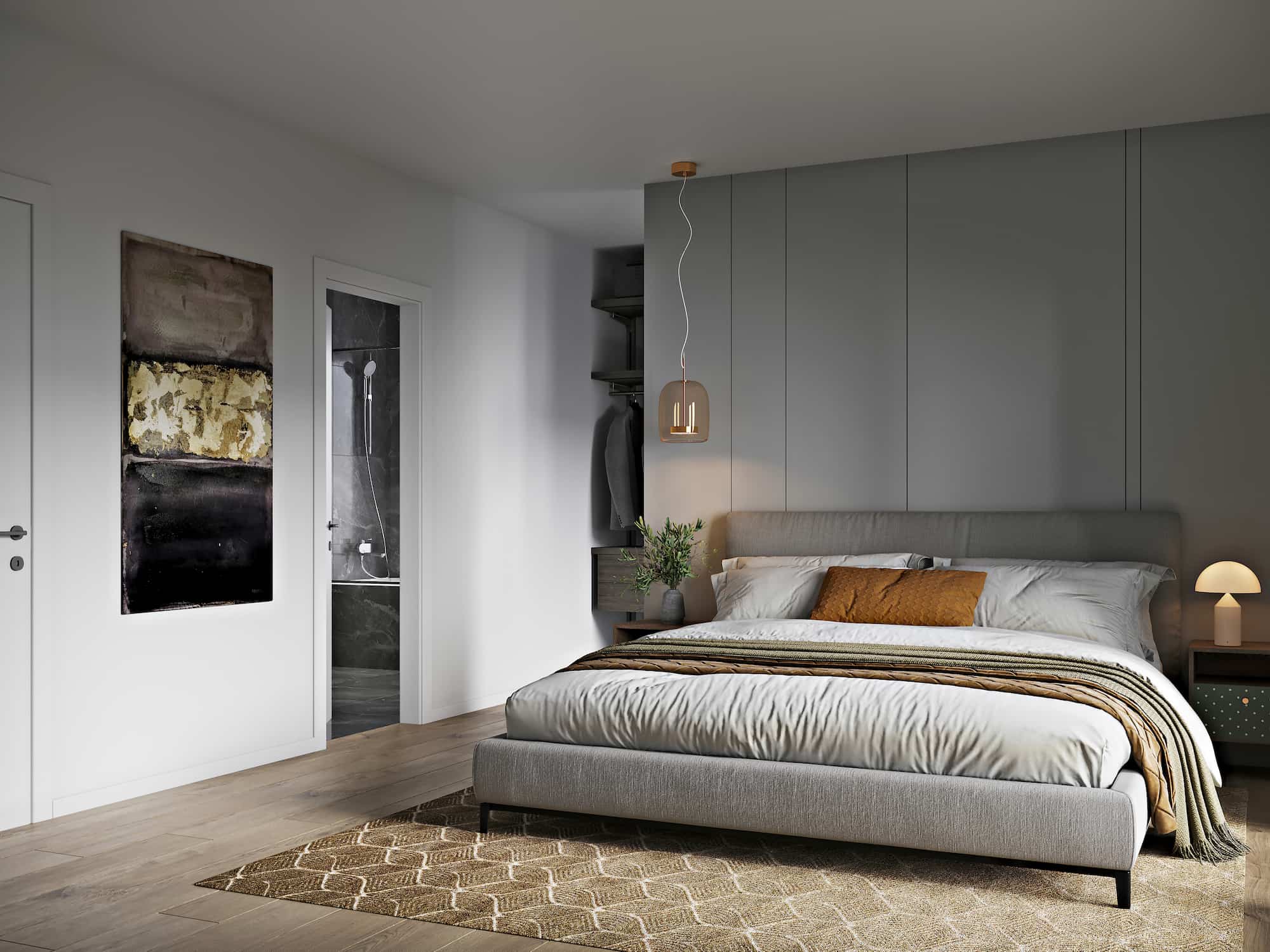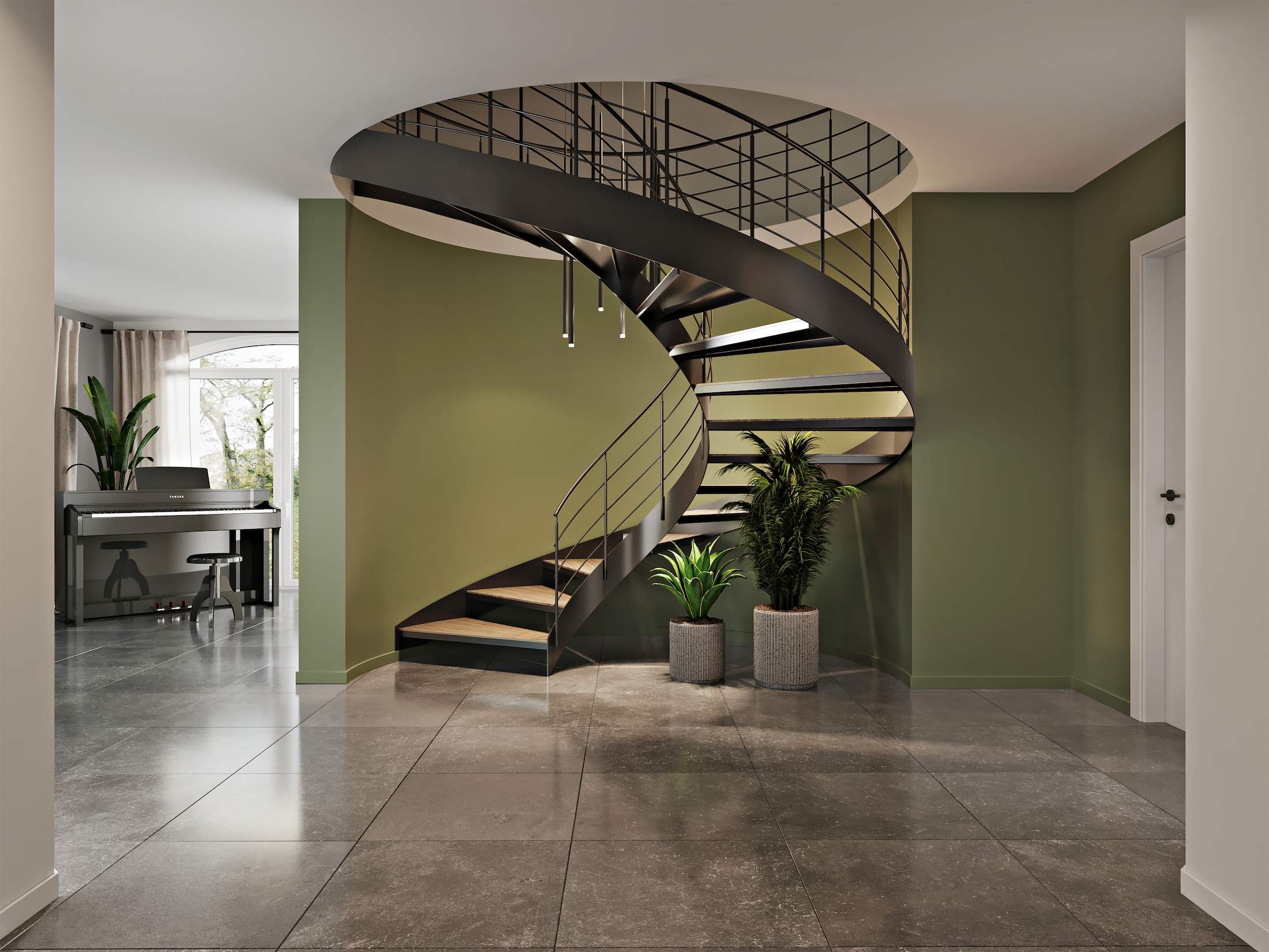 Mit seinem halbrunden Erker schafft es unser Stadthaus Grunewald mit Eleganz zu überzeugen. Er sorgt dafür, dass der gesamte offene Wohn-, Ess- und Kochbereich mit hellem Tageslicht durchflutet wird. Durch eine rundliche Diele und eine zentral liegende Wendeltreppe, werden vorhandene Stilelemente des Hauses aufgegriffen, sodass eine einheitliche Komposition entsteht.