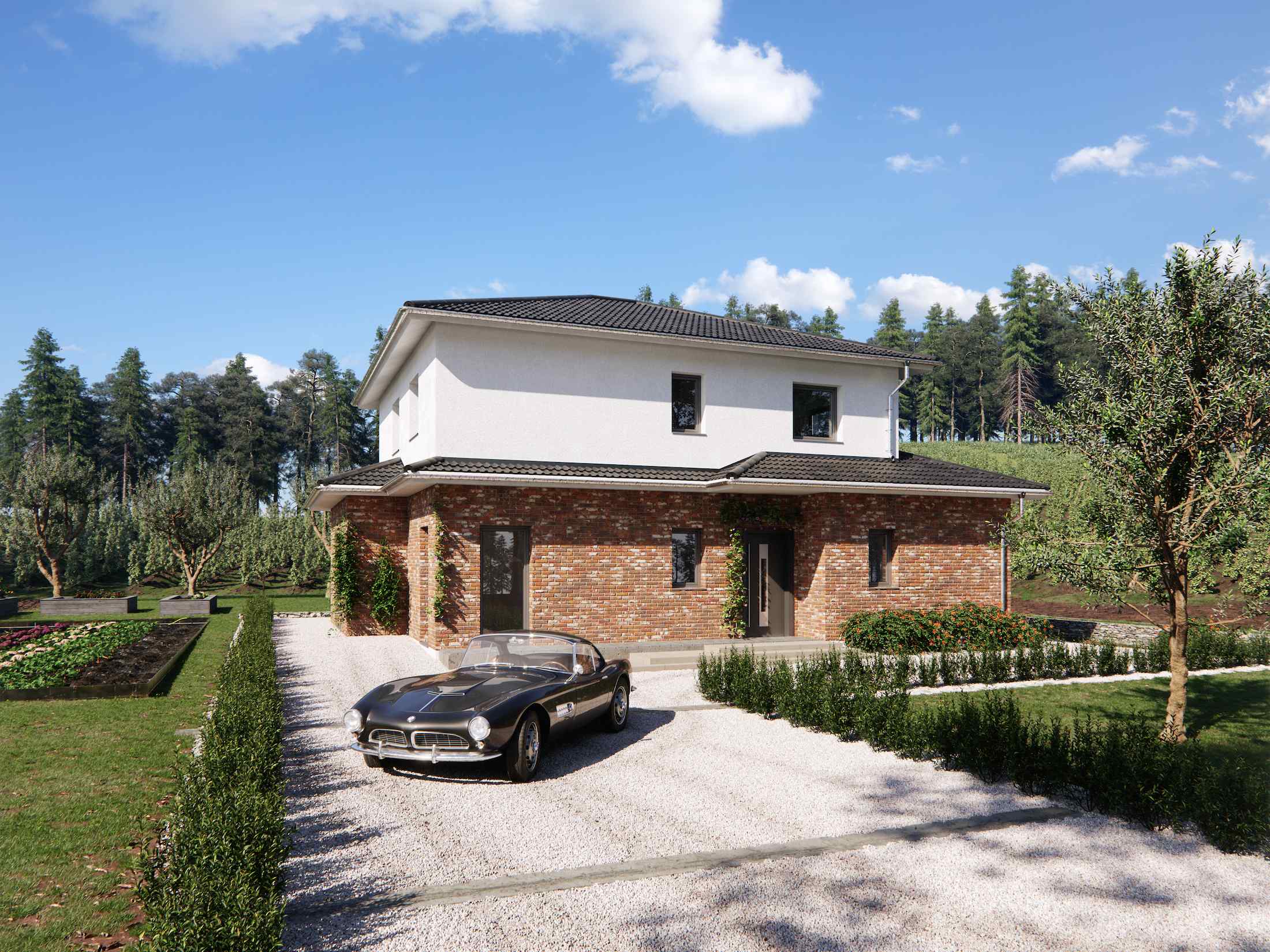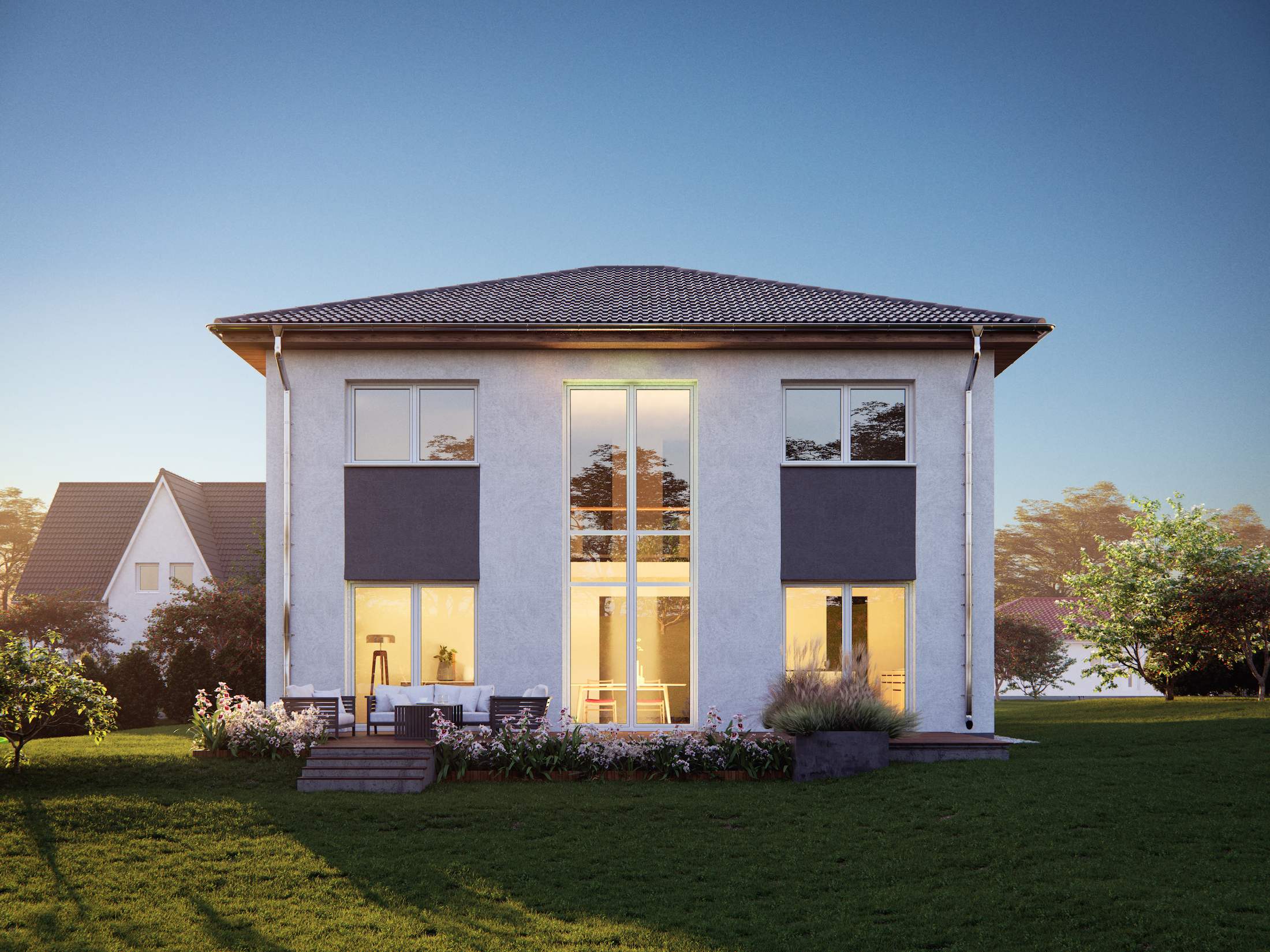 Ein ganz besonderes Urlaubsfeeling verleiht unsere mediterrane Stadtvilla Lindau. Die Verbindung aus einem eher kubischen Hausaufbau mit besonderen Akzenten des Walmdaches ist ein wahrer Blickfang. Durch die spannende Aufteilung des Hauses ist das Erdgeschoss besonders groß und kann mit einem großen Wohn- und Essbereich, einer Küche mit angrenzendem Vorratsraum sowie einem zusätzlichen Gästezimmer überzeugen. Das etwas kleinere Obergeschoss bietet drei Schlafzimmer, ein großes Bad und einen kleinen Büroraum.