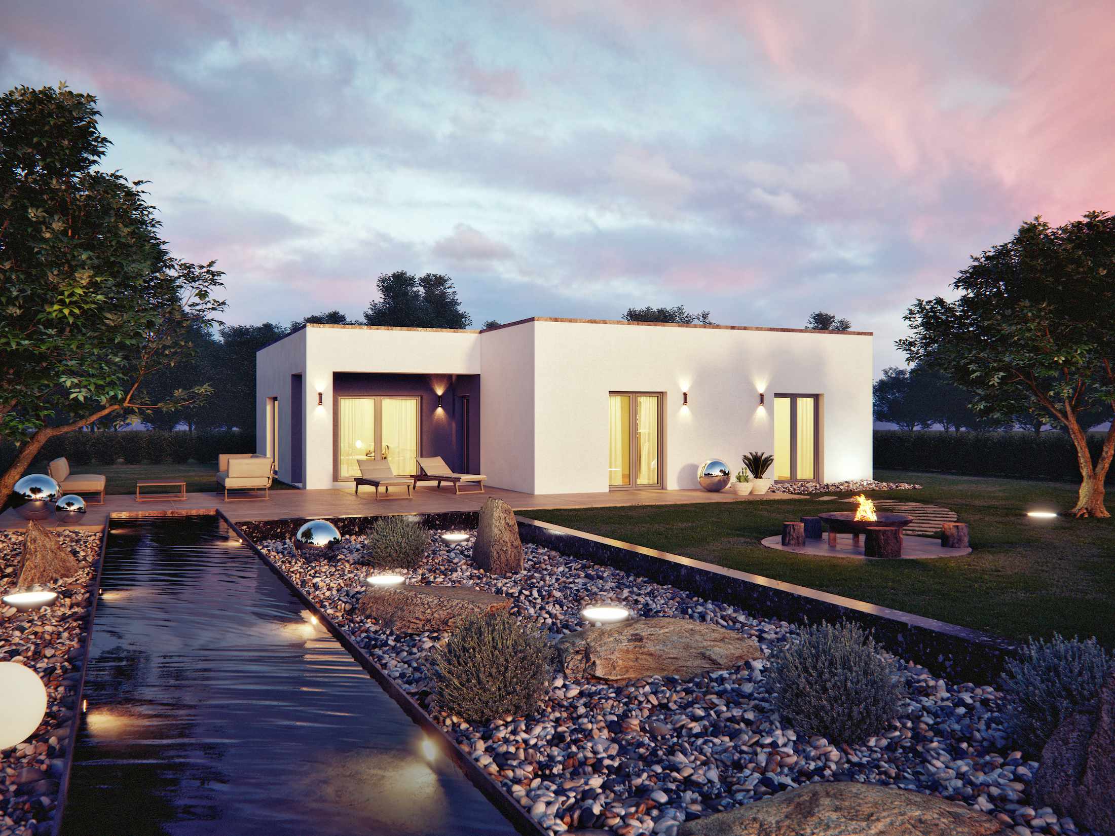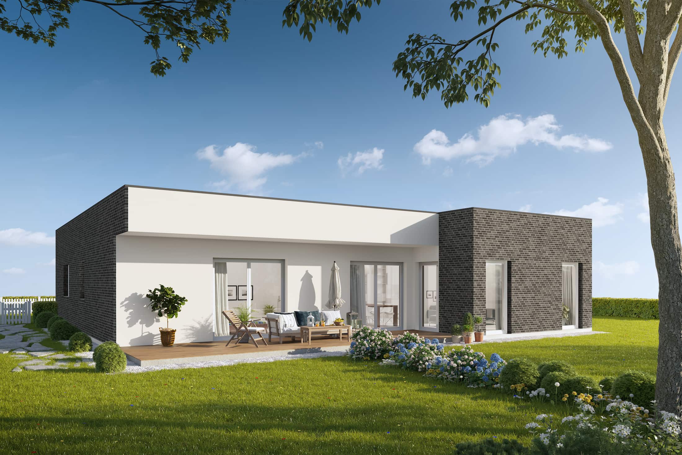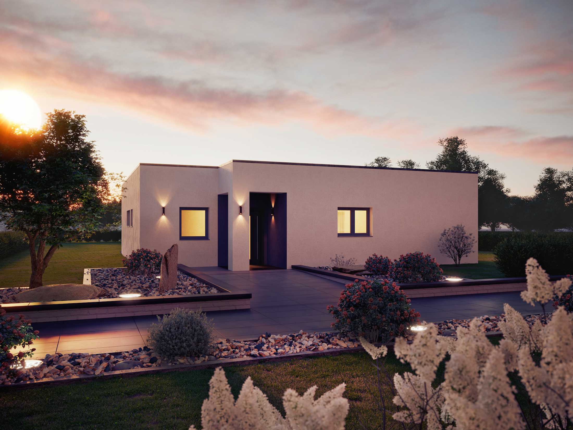 Unser größter Flachdachbungalow ist modern geschnitten und lässt Wohnträume wahr werden. Über den großen und offenen Wohn-, Ess- und Kochbereich gelangt man direkt auf den überdachten Terrassenbereich. Die großen, bodentiefen Fenster sorgen für helle Räume.