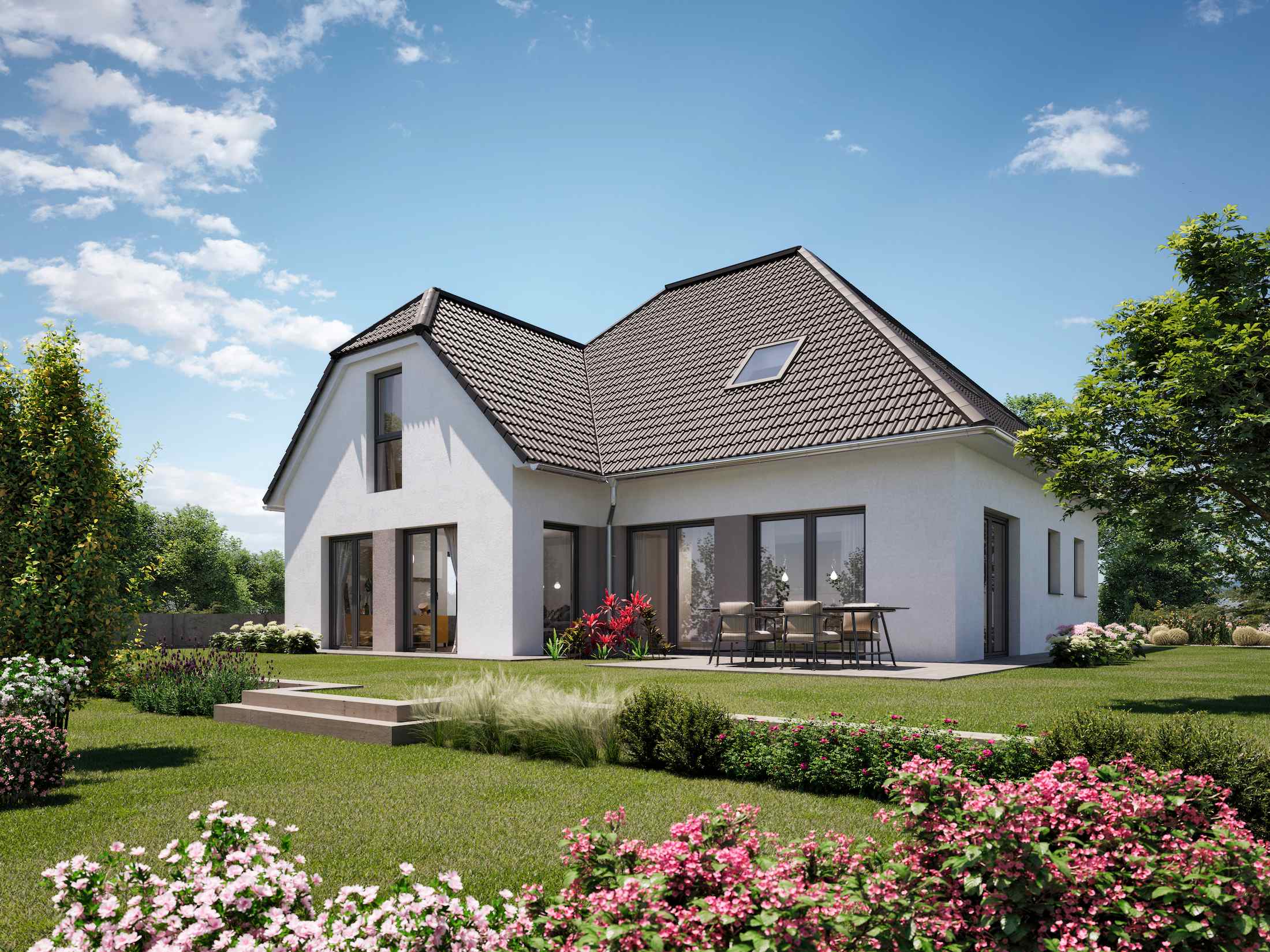 Die Verbindung aus Krüppelwalm- und Walmdach mit verschiedenen Neigungen macht Ihr Traumhaus zum wahren Hingucker. Auch im Innenbereich kann sich Ihr neues Eigenheim sehen lassen, denn bereits die große Diele lädt zum Eintreten ein. Der direkte Weg in das besonders großzügige Wohnzimmer, das mit dem Esszimmer verbunden ist, verdeutlicht die kommunikative und offene Raumplanung.