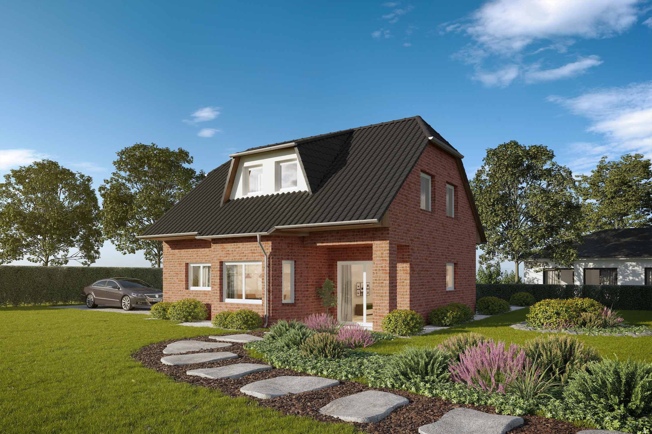 Unser Haus Ilsenburg bekommt durch das Krüppelwalmdach einen ländlichen Charakter, der durch den rötlichen Klinker schön unterstrichen wird. Und auch im Innenbereich sorgt die Dachkonstruktion für eine maximale Ausnutzung der Fläche. Der durch eine schmale Wand getrennte Wohn- und Essbereich sorgt für ausreichende Privatsphäre in beiden Räumen, ohne diese komplett voneinander zu trennen.