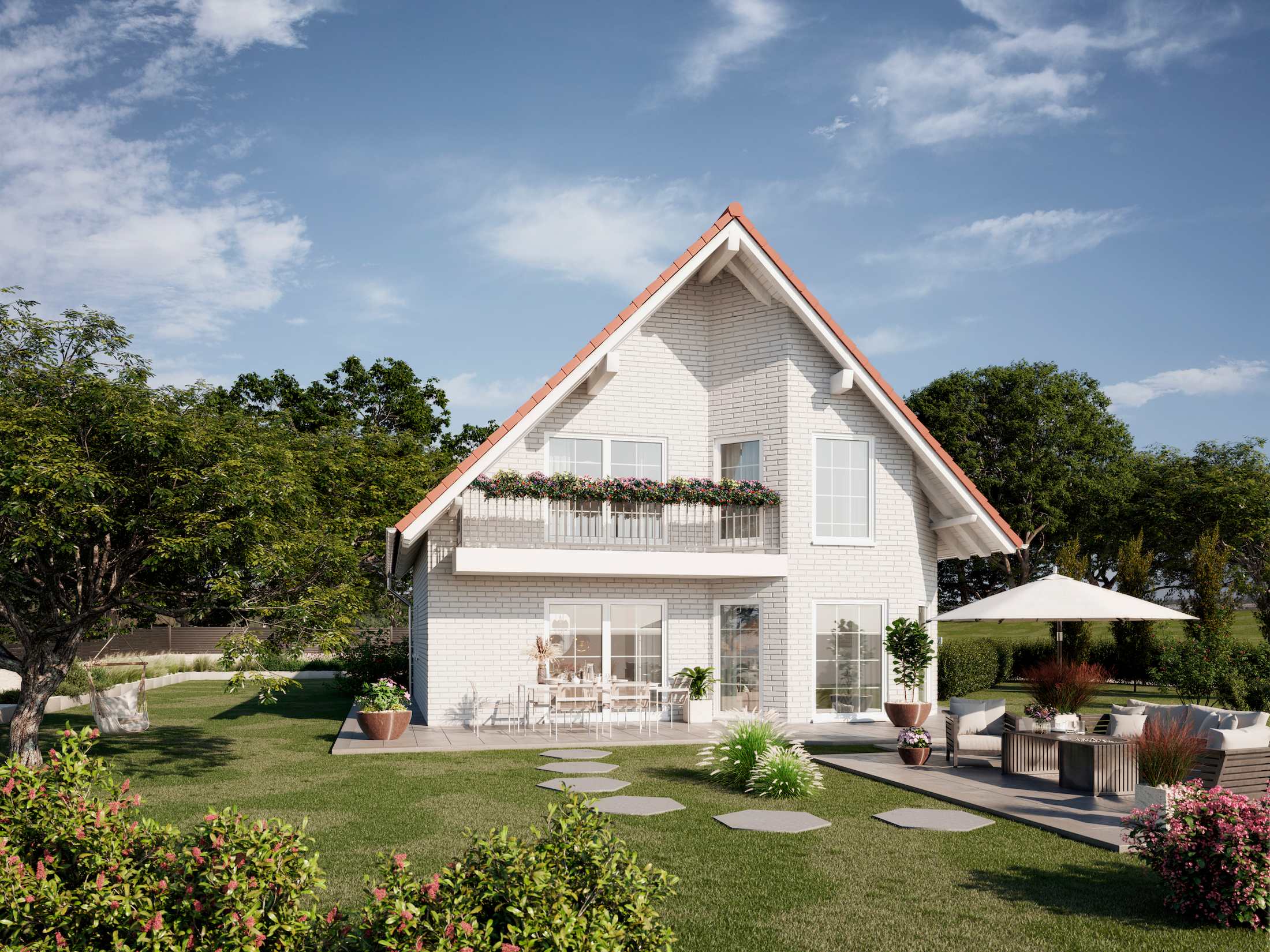 Unser Stadthaus Drömling zeichnet sich durch seine sichtbaren Pfettenköpfe und einen trapezförmigen Erker aus, der dem Eigenheim besonderen Charme verleiht. Der offene Wohn- und Essbereich ist optimal für Bauherren, die große Wohnflächen mögen. Der Balkon im Obergeschoss kann durch das Hauptschlafzimmer erreicht werden.