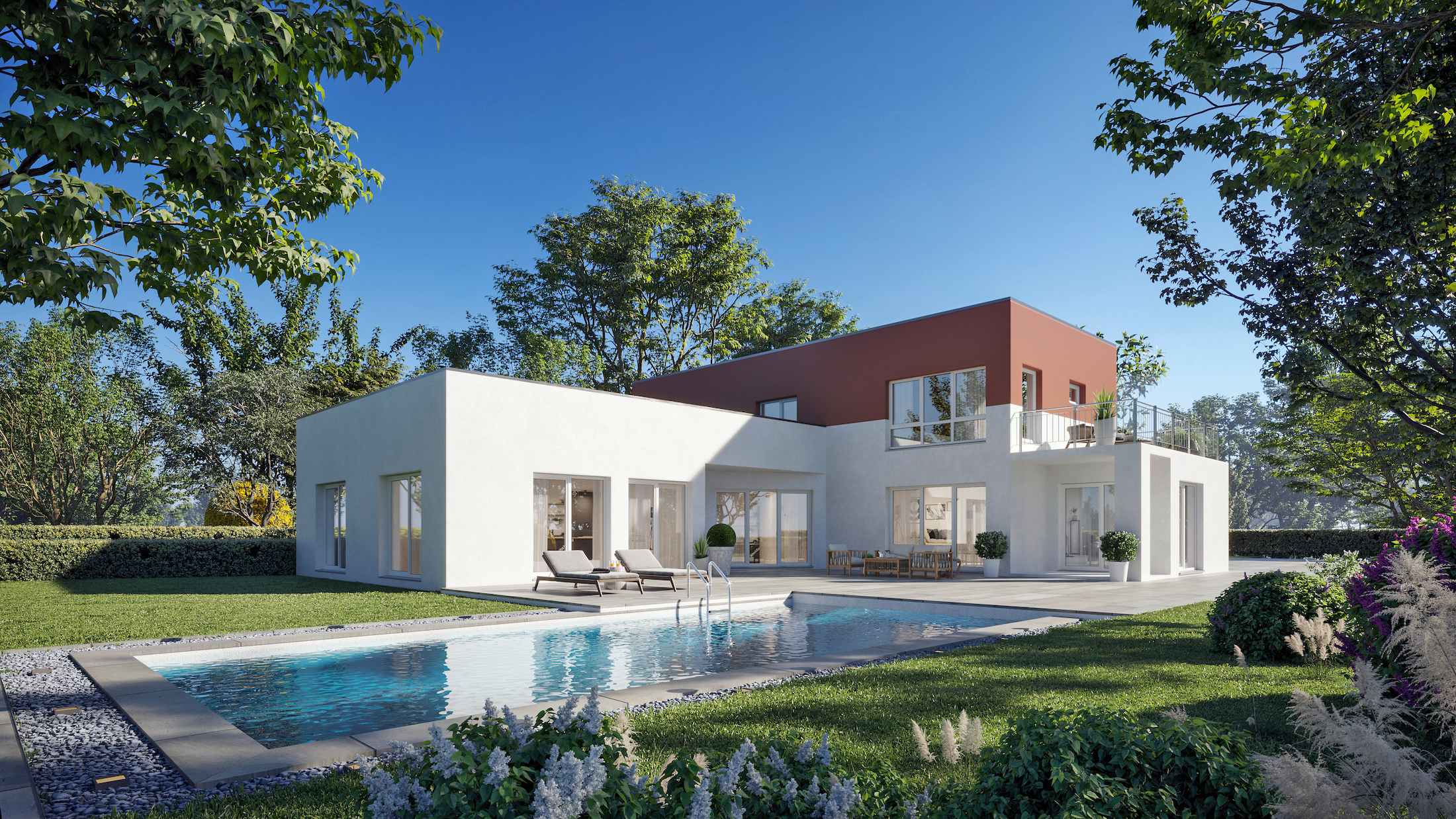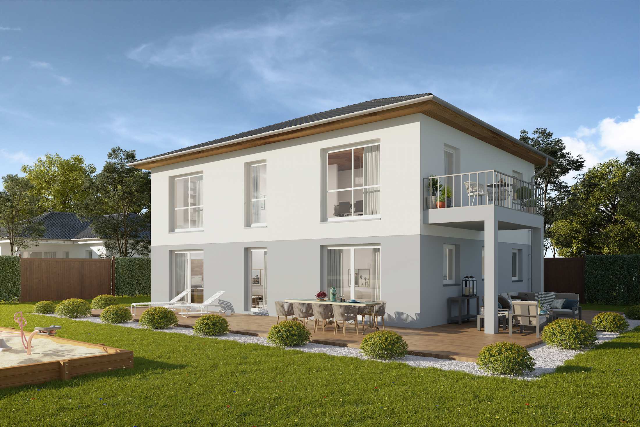 Ein ganz besonderes Urlaubsfeeling verleiht unsere mediterrane Stadtvilla Lindau. Die Verbindung aus einem eher kubischen Hausaufbau mit besonderen Akzenten des Walmdaches ist ein wahrer Blickfang. Durch die spannende Aufteilung des Hauses ist das Erdgeschoss besonders groß und kann mit einem großen Wohn- und Essbereich, einer Küche mit angrenzendem Vorratsraum sowie einem zusätzlichen Gästezimmer überzeugen. Das etwas kleinere Obergeschoss bietet drei Schlafzimmer, ein großes Bad und einen kleinen Büroraum.